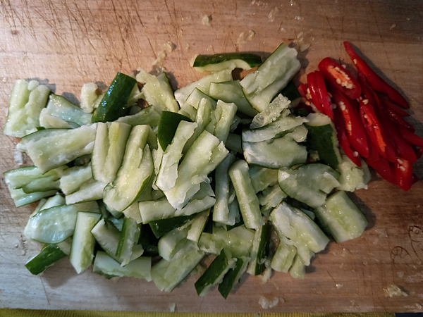 3. 將辣椒切段,並將剛切段好的小黃瓜以啪的方式啪壓(通常一啪就會成4塊,用啪的目的再於小黃瓜比較容易吸附調味料),蒜頭也是用啪碎的方式